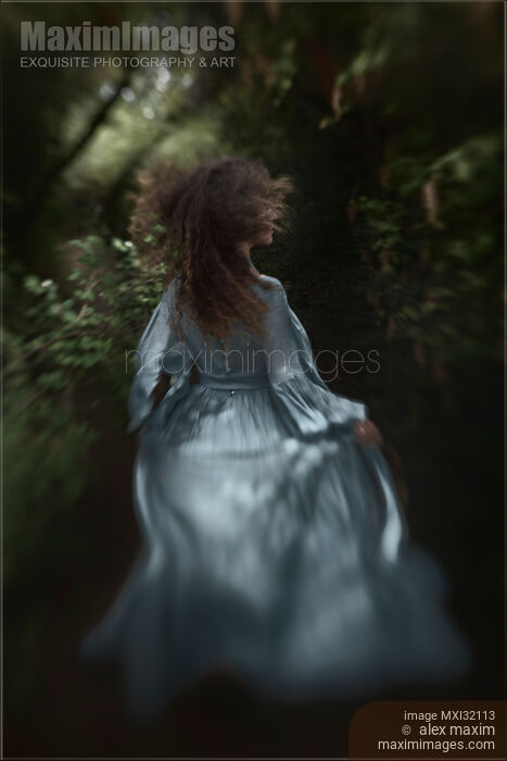 Photo Of Dramatic Rear View Portrait Of A Woman Running Away Into A Deep Dark Forest Stock Image Mxi32113